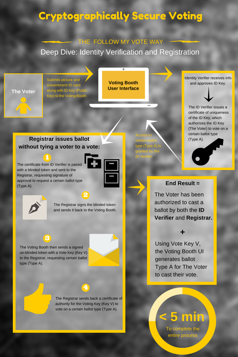 To summarize the above infographic, Follow My Vote is simply taking the current process of voting in an election on Election Day (in a state with Voter ID laws) and bringing that process entirely online, in an attempt to make it easier, more secure, and even more cost effective for everyone involved.
